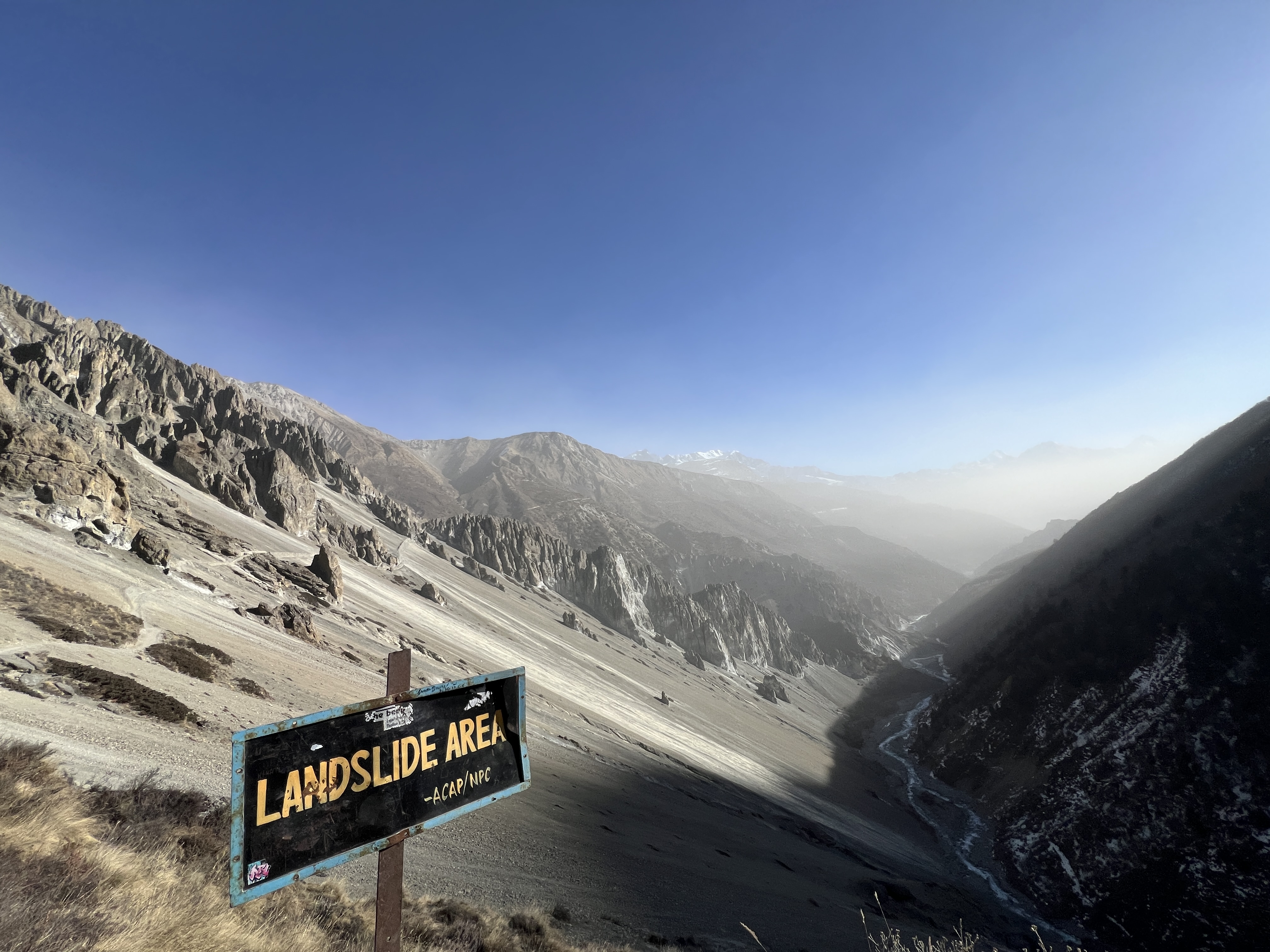 이틀 전에 왔던 코스라 풍경을 보는 여유보다는 지프를 탈 수 있을지에 신경 쓰며 빠르게 걸었다. 기침은 계속 나왔지만 컨디션은 생각보다 나쁘지 않았다. 하산길이라 배낭도 가볍게 느껴졌고, 오늘만 걸으면 트레킹이 끝난다는 생각에 의욕도 넘쳤다. 랜드슬라이드 구간의 그 절벽 같은 길도 올라갈 때는 갈 만했다. 물론 중간에 멈추면 미끄러지기 때문에 한 번에 쉬지 않고 끝까지 올라야 해서 쉽진 않았지만. 예상보다 빨리 중간 마을인 시리가르카에 도착했고, 잠시 목만 축인 뒤 다시 출발했다. 해발고도가 내려갈수록 몸이 점점 가벼워지는 느낌이 들었고, 이 페이스라면 오후 2시 전 마낭 도착도 가능해 보였다.