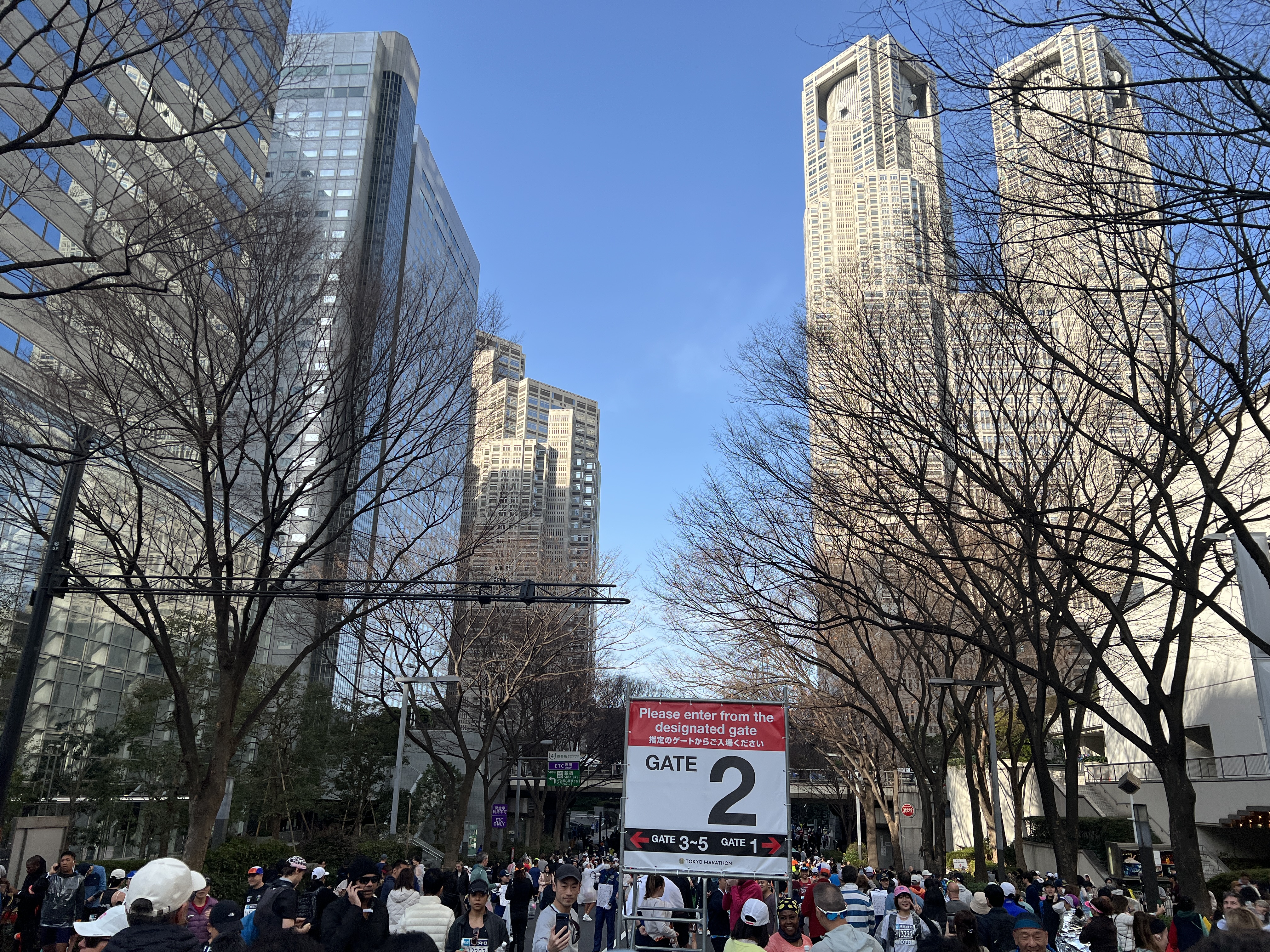 도쿄 마라톤은 사람마다 입장 게이트가 다르다. 총 다섯 개의 게이트가 있고, 나는 2번 게이트였다. 신주쿠역에서 2번 표지만 따라가면 된다. 입장 전에는 패킷과 팔찌를 확인하고 보안 검사까지 진행한다. 이 과정에도 많은 자원봉사자들이 배치되어 있었다.
