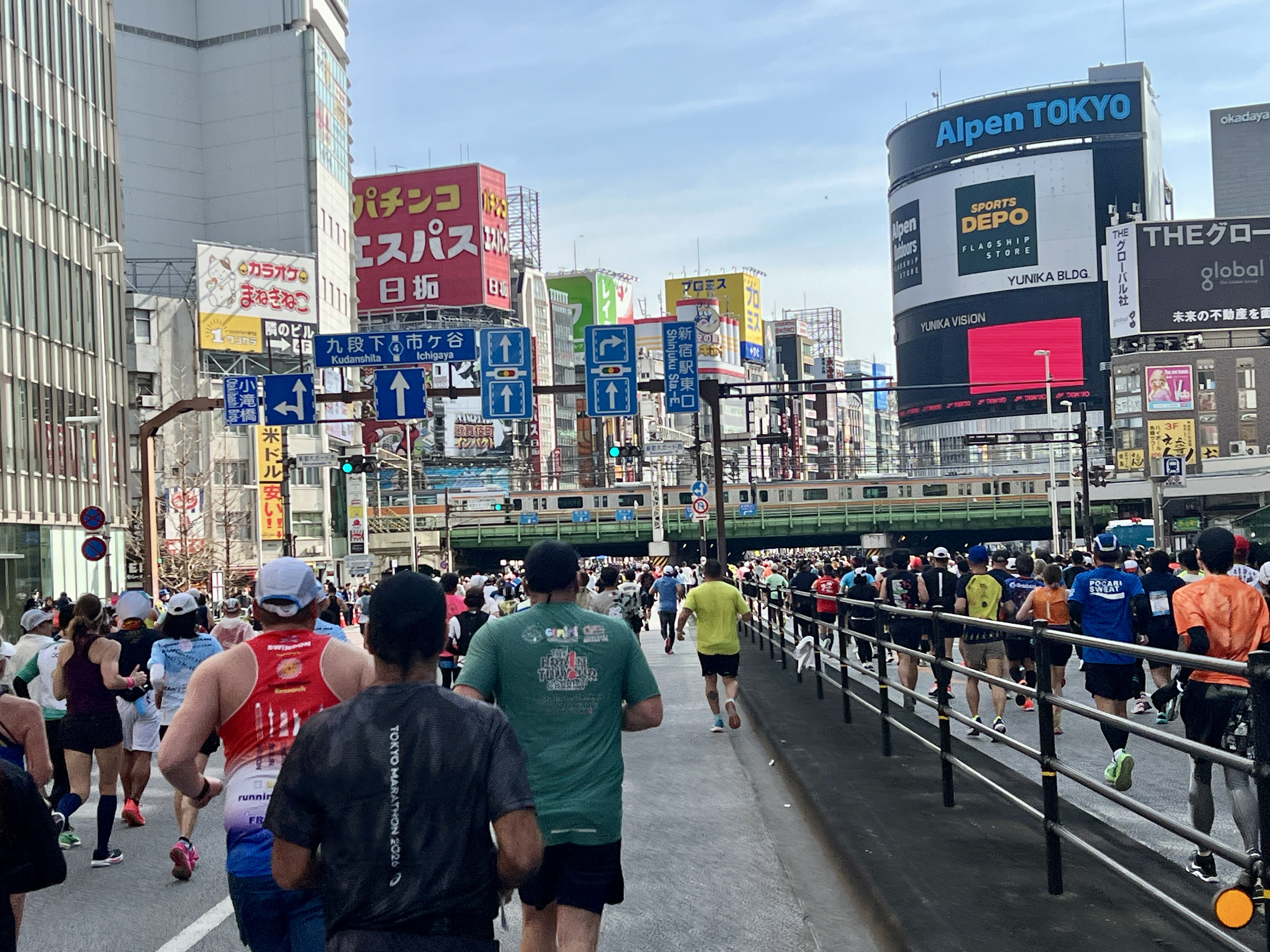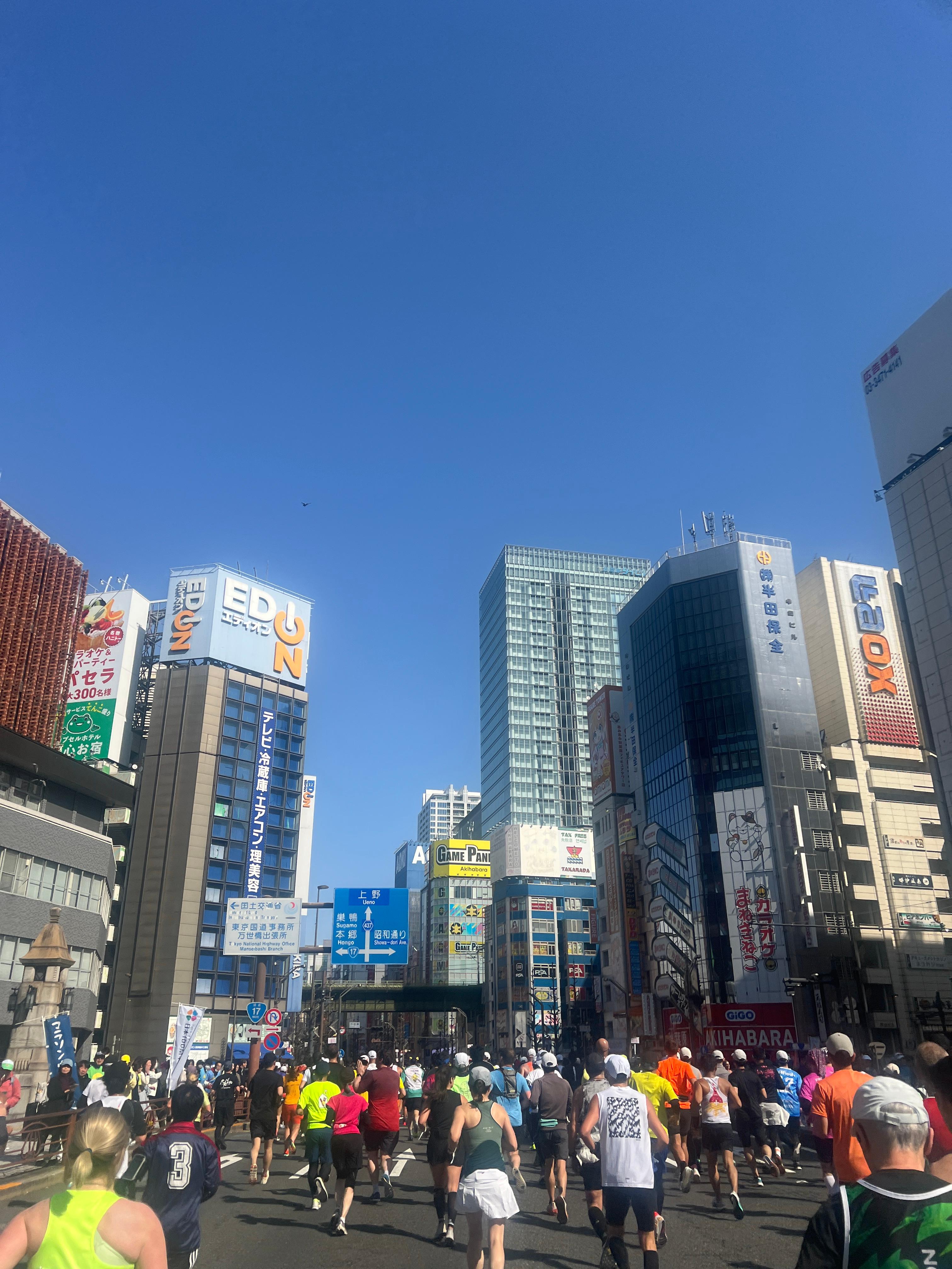 정식 출발 시간은 9시. 하지만 워낙 인원이 많아 나는 약 30분 뒤에야 출발선을 밟았다. 도쿄의 빌딩 숲을 달리는 기분이 좋았다. 2km 지점에서 신주쿠 중앙거리를 지나는데, 그 거리를 직접 뛰어간다는 사실이 새삼스럽게 느껴졌다. 한국 마라톤은 2~3km만 지나면 병목 구간이 해소되는데, 여기는 참가자가 워낙 많아 끝날 때까지 어느 정도 혼잡이 이어졌다. 물론 추월하려면 할 수 있지만, 좌우로 움직이며 치고 나가야 해서 체력 소모가 더 크다. 주변에 계속 러너들이 있어 3만 9천 명이 함께 달리는 거대한 러닝 크루 같은 느낌이었다.
