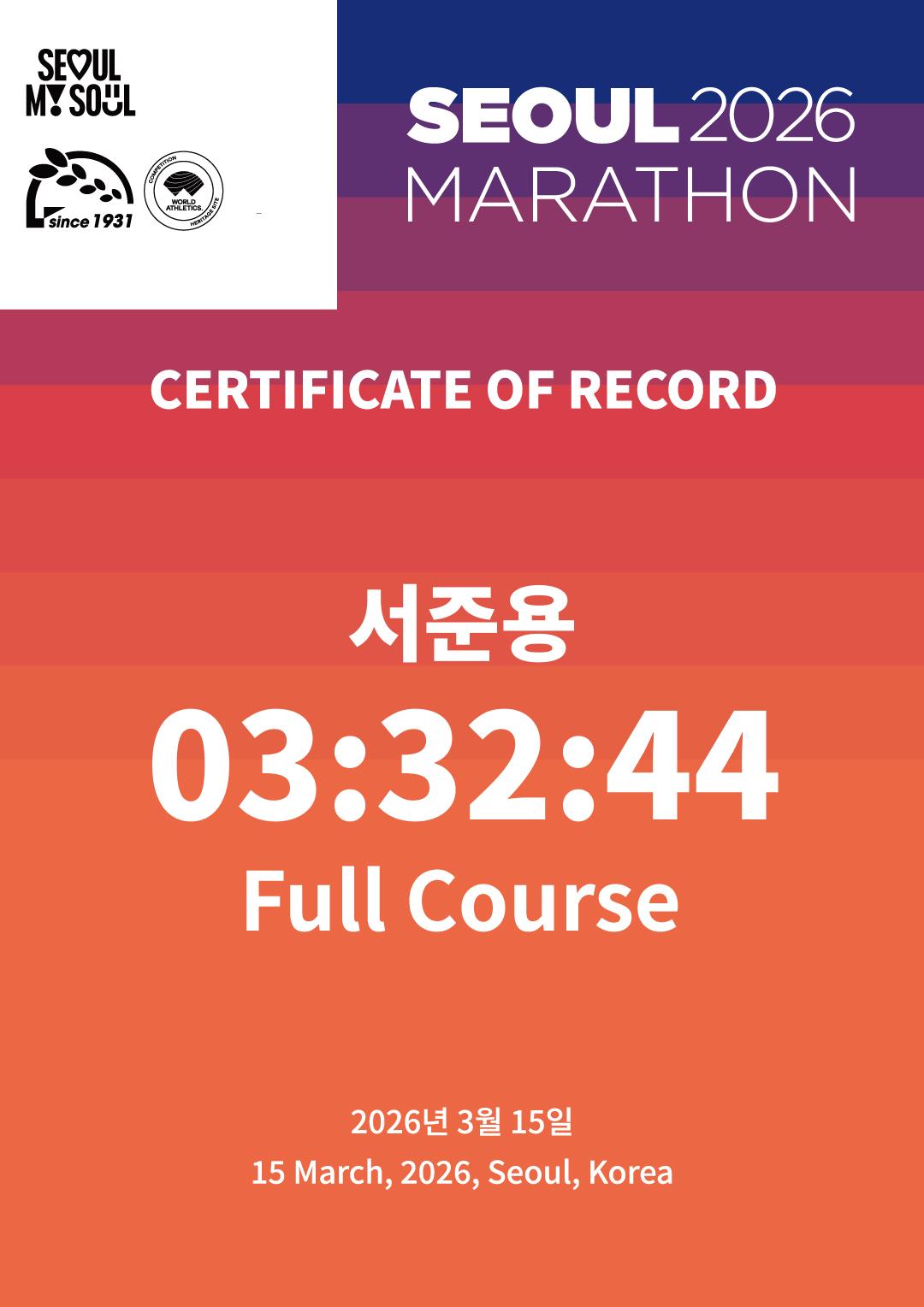 결국 3시간 32분 44초의 기록으로 골인했다. 작년 춘천마라톤보다 4분 단축한 기록이다.