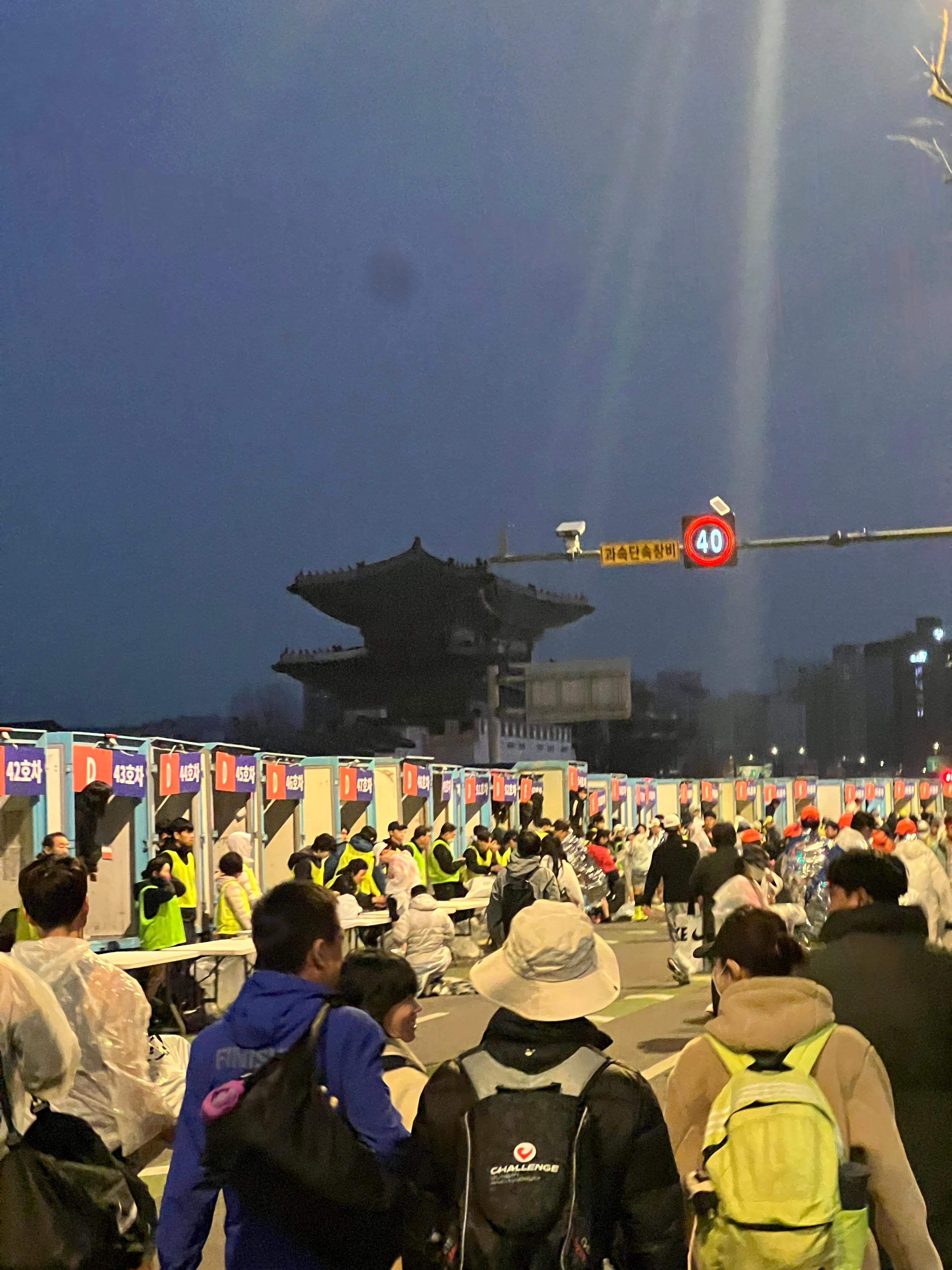 아침 6시 30분. 출발 집결지인 광화문광장에 도착했다. 날씨가 추워 최대한 늦게 러닝복으로 갈아입고 물품보관소에 짐을 맡겼다. 화장실에 가려고 공영주차장으로 갔는데, 지하라 그런지 따뜻했다. 출발할 때까지 그곳에서 대기했다.